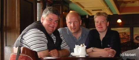 Das Essen war übrigens deliceous. Petra hatte Roast of the day (beef), vier Scheiben, Norbert ein 10oz Steak, das einfach riesig war (wie das dazugehörige Messer) ich futterte mich durch einen Mixed Grill: Steak, zwei Rashers (bacon), zwei Sausages, Egg, Black & White Pudding und Mashed Potatos. Super lecker, wie der Coffee. Jetzt überlegen wir, ob wir die Dessert-Card ordern...